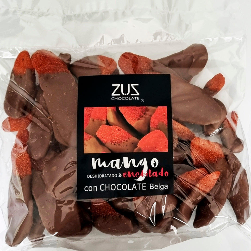 Cont. 1 kg de mango deshidratado enchilado cubierto de chocolate belga con leche