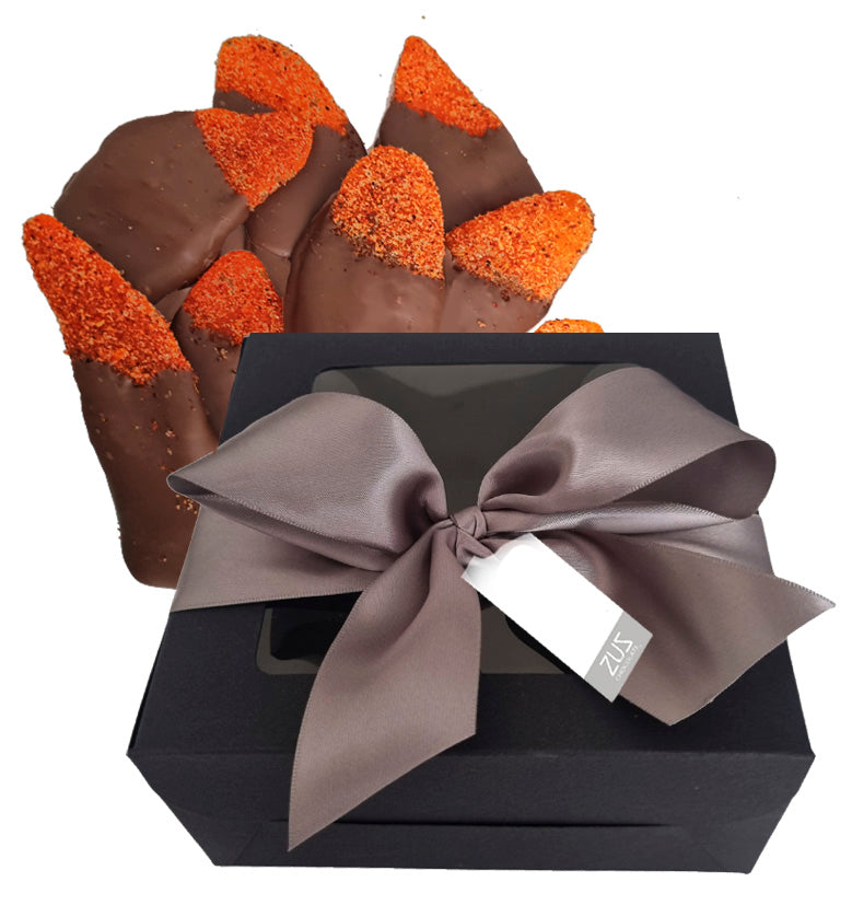 Caja con 250 g de ango enchilado cubierto de chocolate belga con leche